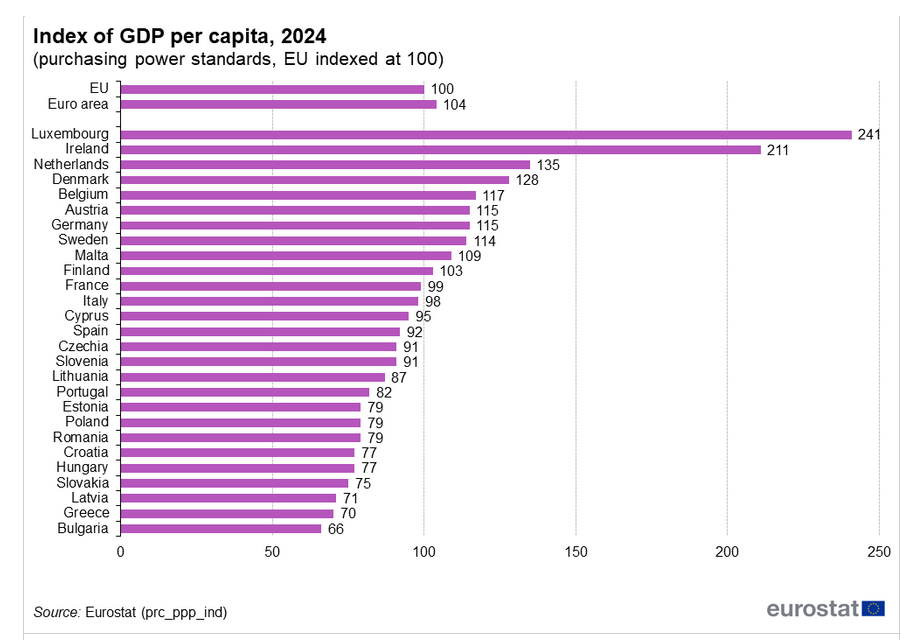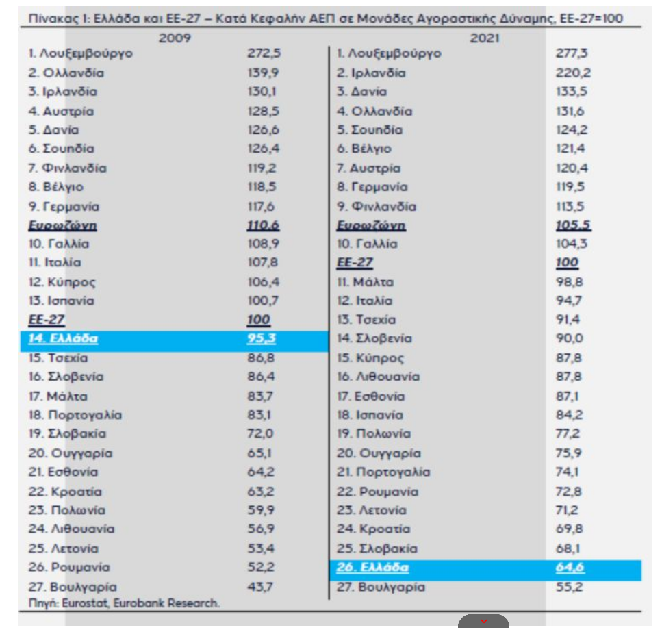 Το 2021, η Ελλάδα βρισκόταν στην προτελευταία θέση μεταξύ των 27 χωρών μελών της Ε.Ε. όσον αφορά τη αγοραστική δύναμη των κατοίκων της. Η τελευταία χώρα, με διαφορά εννέα μονάδων από εμάς, ήταν η Βουλγαρία. Να σημειωθεί ότι το 2009, η χώρα μας βρισκόταν σχεδόν στη μέση της λίστας των χωρών μελών της Ε.Ε., με τον δείκτη να βρίσκεται κατά 48% υψηλότερα!