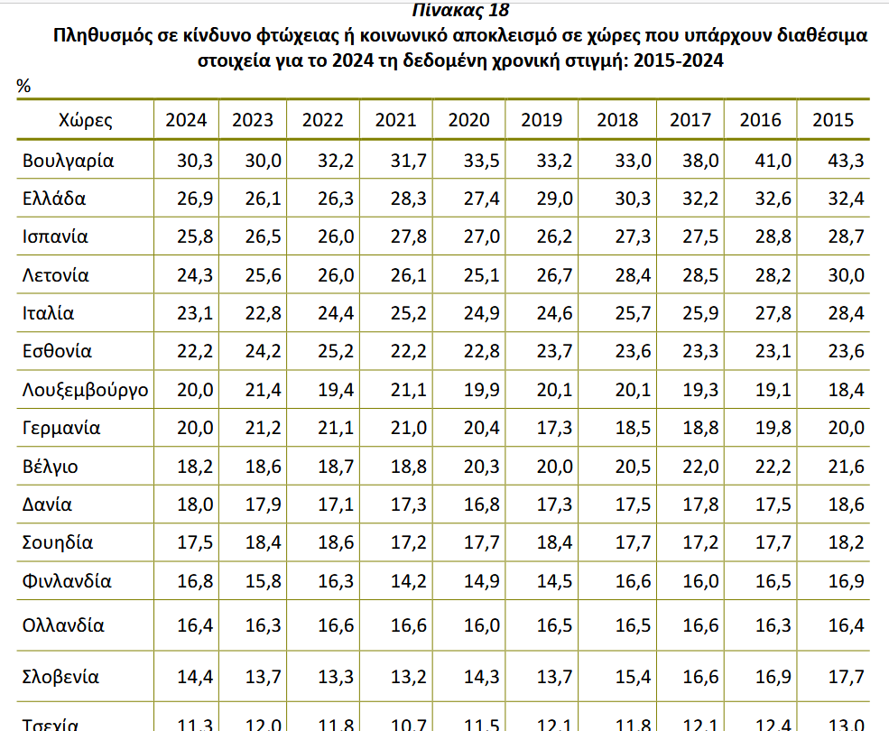 Την ίδια χρονιά, σχεδόν το 27% των Ελλήνων βρισκόταν σε κίνδυνο φτώχειας, πριν την παροχή κοινωνικών επιδομάτων. Η χώρα μας βρίσκεται, δυστυχώς, εδώ και πολλά έτη στην προτελευταία θέση της Ε.Ε.. Όπως διακρίνεται από τον παρακάτω πίνακα της ΕΛΣΤΑΤ, μας ακολουθεί η Βουλγαρία, η οποία, όμως, μειώνει συνεχώς την ψαλίδα!