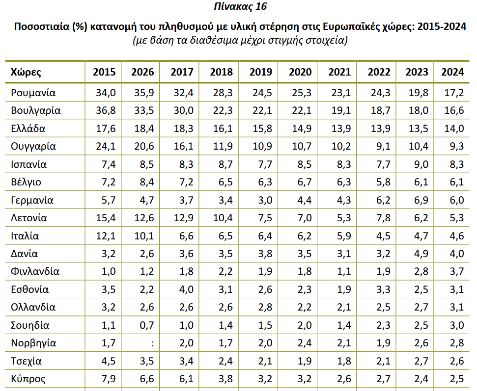 Τέλος, πέρυσι βρισκόταν σε υλική στέρηση το 14% των Ελλήνων. Όπως, όμως, φαίνεται από τον επόμενο πίνακα της ΕΛΣΤΑΤ, οι «ανταγωνίστριες» χώρες, Ρουμανία, Βουλγαρία, Ουγγαρία και Πολωνία, παρουσιάζουν συνεχή βελτίωση, με συνέπεια να βρισκόμαστε, πλέον, μόνο και λίγο πίσω από τη Βουλγαρία και τη Ρουμανία!