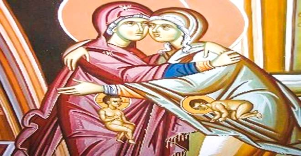 Η Θεοτόκος, μετά τον Ευαγγελισμό της, έγκυος πλέον, επισκέφτηκε την ξαδέλφη της Ελισάβετ, που ήταν ήδη έγκυος έξι μηνών στον Άγιο Ιωάννη τον Πρόδρομο. [1] Όπως αναφέρει ο Ευαγγελιστής Λουκάς, όταν ασπάστηκαν οι δύο γυναίκες, το βρέφος στην κοιλιά της Ελισάβετ, ο Ιωάννης δηλαδή, σκίρτησε. [2]